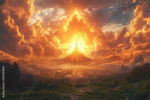 © julija, Naklejka premium radiant illustration of the new jerusalem, the holy city of zion, glowing with divine glory against a lush grassy plain, capturing biblical imagery and the promise of a new earth in stunning detail