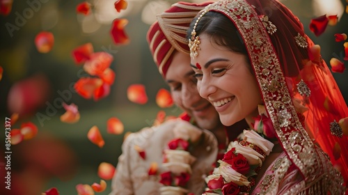 Fototapeta premium Radiant Indian Bride in Traditional Red Sari and Ornate Veil Amid Vibrant...