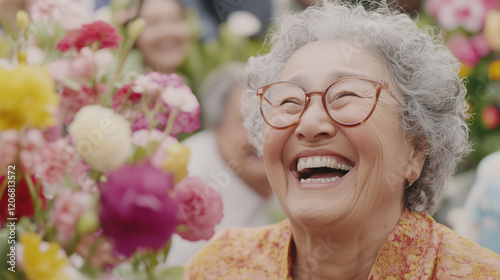 © pattozher, Obraz premium Radiant Joy: An elderly woman with a radiant smile, surrounded by vibrant flowers, exudes happiness and the beauty of aging gracefully.