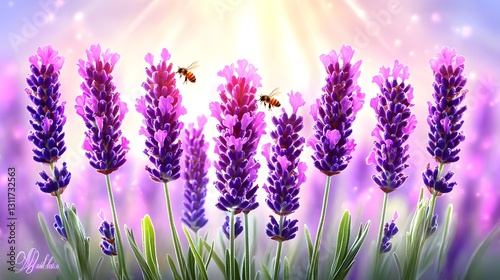 © Supawadee, Naklejka premium Radiant Lavender Flowers with Honeybees in Soft Light