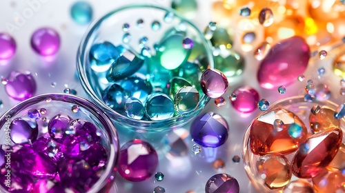 © Keattipoom, Naklejka premium Radiant Liquid Gems Overflowing into Miniature Bowls on White Background