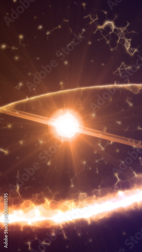 © Bolbik, Fototapeta premium Radiant orange cosmic burst with glowing rings and star-like particles swirling around a bright central core