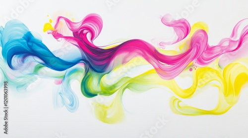 © Sinechana, Fototapeta premium 119.Radiant plumes of fume in bold colors such as magenta, cyan, and lime green, curling and overlapping to form a captivating abstract design against a white canvas.
