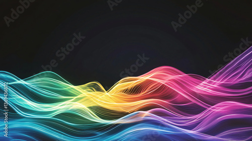© ArtSync Studio, Naklejka premium Radiant Rainbow Waves Elegant Flowing Abstract Design with Black Background Artistic Visualization