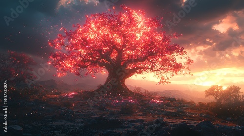 Naklejka premium Radiant Red Tree Glowing in a Dreamlike Landscape at Sunset