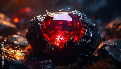 © rin.id, Fototapeta premium Radiant Ruby Embedded in a Dark Volcanic Rock
