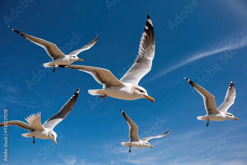 © Michael, Fototapeta premium Radiant Seagulls in Flight Against a Royal Blue Sky