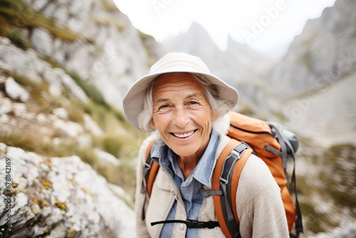 Naklejka premium Radiant senior woman with backpack enjoying a hike in the mountains