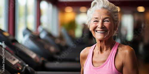 © Bartek, Fototapeta premium Radiant Senior Woman with White Hair Smiling in Gym, Representing Active Lifestyle and Healthy Aging