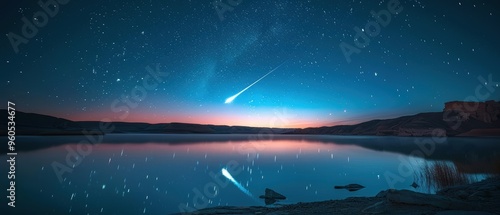 © Starkreal, Naklejka premium Radiant Shooting Star Illuminating Tranquil Lake at Night