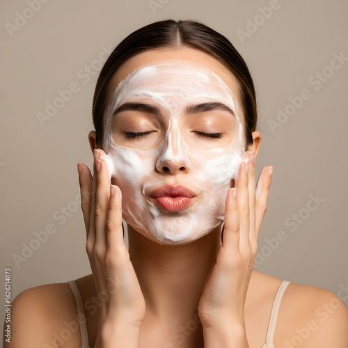 © Siti, Fototapeta premium Radiant Skin Cleansing Facial Wash Beauty Skincare Routine Woman Face Cream