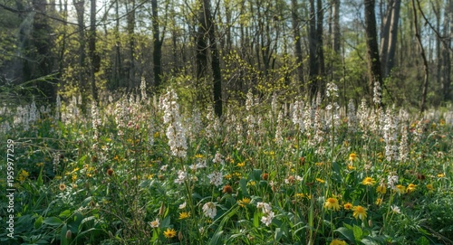 Naklejka premium Radiant spring woodland with blossoming wildflowers and thick greenery