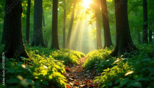 Fototapeta premium Radiant sunlight illuminates dappled forest floor amidst lush green,...