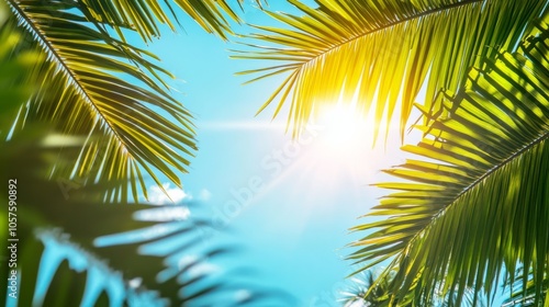 Fototapeta premium Radiant sunlight through tropical palm leaves, bright blue sky background