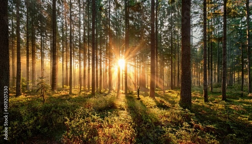 Obraz premium radiant sunrise casts a golden glow through the dense forest illuminating the...