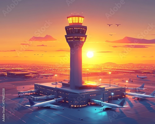 © Nattapat, Obraz premium Radiant sunset casting golden light over a low poly airport terminal, sleek control tower standing tall, jets landing on a lively apron, stunning isometric composition
