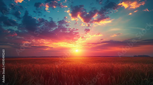 © Sergii, Fototapeta premium Radiant sunset over a golden field, clouds ablaze with color, horizon ablaze with the sun's light.