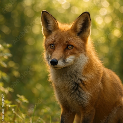 © Jelena, Fototapeta premium Radiant tropical bird perched among sunlit heliconia and banana leaves saturated plumage sparkling bokeh and lush garden atmosphere for vibrant wildlife editorial appeal