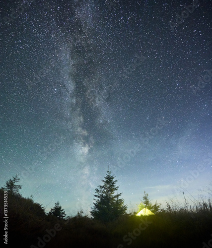 Fototapeta premium Radiant yellow tent beneath awe-inspiring, star-filled sky with Milky Way prominently stretching across. Surrounded by pine trees and silhouetted by hill, scene epitomizes tranquility of nature.