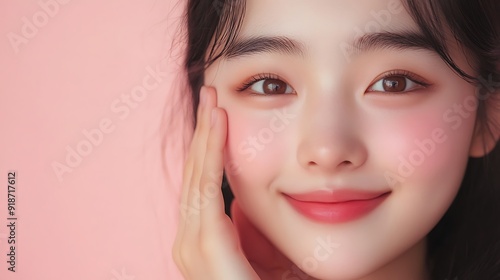 © aironamad, Obraz premium Radiant Young Woman Smiling Brightly Against a Soft Pink Background