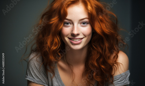 Fototapeta premium Radiant Young Woman with Freckles and Curly Red Hair Smiling Cheerfully in a...