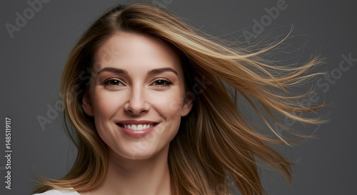 © Grosir, Fototapeta premium Radiant Young Woman with Wind Swept Blonde Hair Smiling Against Gray Background in Soft Lighting