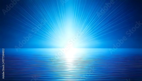 Fototapeta premium Radiating blue light bursts above rippling water, creating a serene, abstract...