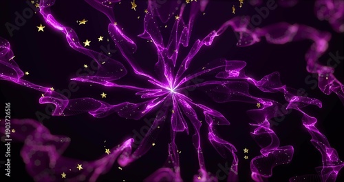 Fototapeta premium Radiating central magenta light core emitting mesh ribbon streams in black backdrop with gold stars