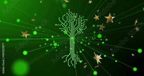 Fototapeta premium Radiating green circuit-tree shape glowing in virtual environment, with gold stars and glowing orbs