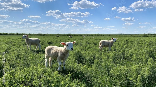 © AbstractAI, Fototapeta premium Radio-collared lambs grazing peacefully in a vibrant green pasture under a bright blue sky with fluffy clouds.