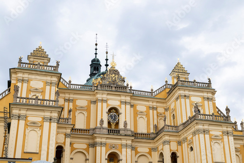 © Richard Semik, Obraz premium Radkow church facade with clock, domes, and ornate gold decorations