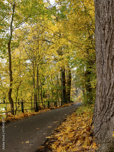 Fototapeta premium Radweg mit bunter Blättern im November durch den Wald in die Stadt