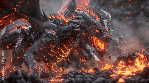 Naklejka premium Raging Elemental Dragon Unleashes Molten Lava Breath Amidst Volcanic Eruption...