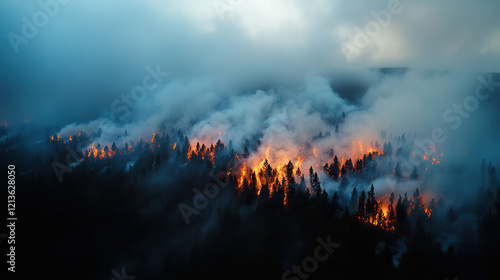 © Worakit, Obraz premium raging wildfire engulfs dense forest, with flames and smoke creating dramatic and intense scene under cloudy sky