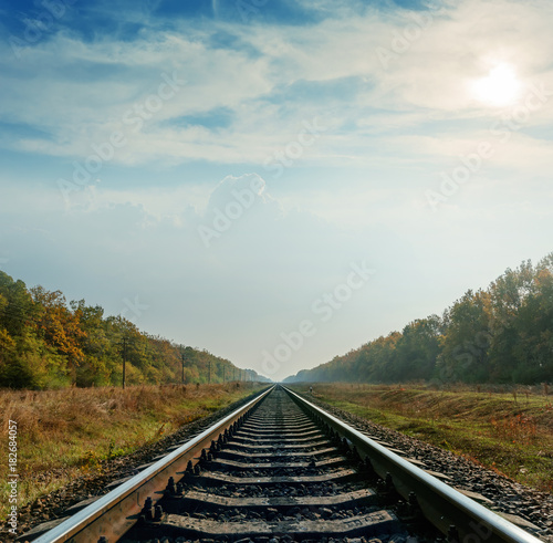 © Mykola Mazuryk, Fototapeta premium railroad closeup goes to horizon under cloudy sky with sun