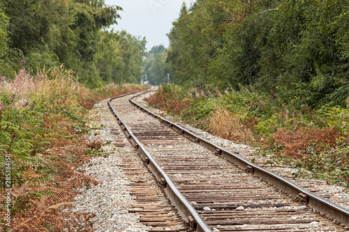 © Yi, Fototapeta premium railroad in the country side with trees and bushes on both sides on an over cast day