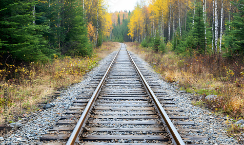 Fototapeta premium Railroad perspective amid autumn foliage. Tracks lead into the horizon...