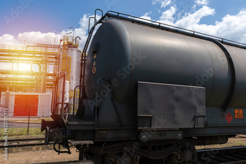 Naklejka premium Railroad tank cars near oil refinery. Railway train wagon to transport liquid...