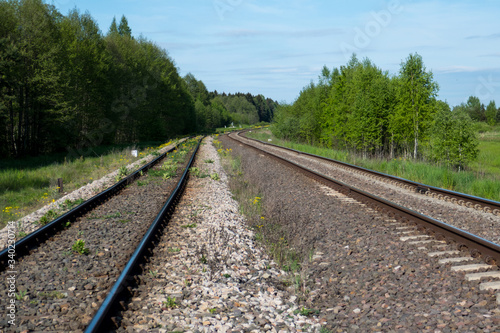 Obraz premium Railroad through lush deciduous forest, near the border to Belarus, in...