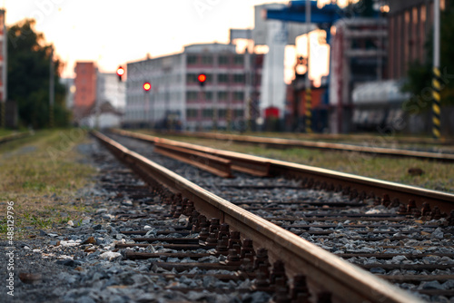 © encierro, Fototapeta premium Railroad track at industrial area. Selective focus. Rail transportation. Railway in city