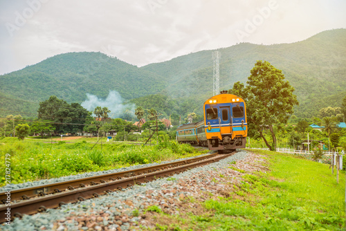 © petcharapj, Obraz premium Railroad track bridge crossing river (white bridge painted pink) at Thailand