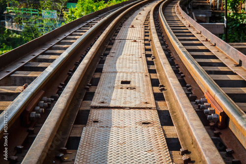 © sundaymorning, Naklejka premium Railroad track curve around a bend in thailand