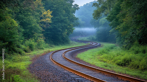 Fototapeta premium railroad track curves gently through vibrant green foliage, creating a tranquil scene that symbolizes journey, hope, and the seamless blend of nature and travel