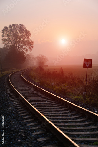 © tomaspic, Fototapeta premium Railroad track during autumn foggy morning