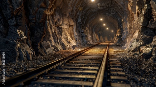 © iVGraphic, Naklejka premium Railroad track inside an illuminated rocky tunnel