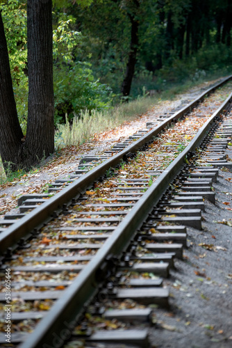 Fototapeta premium Railroad track leading through forest. Rails strewn with autumn leaves. Vertical frame