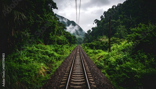 Fototapeta premium Railroad track leads through lush tropical forest towards misty mountains