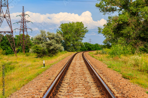 © olyasolodenko, Fototapeta premium Railroad track through a green pine forest