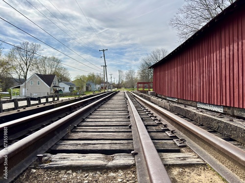 © Cavan, Fototapeta premium Railroad tracks beside red covered bridge running through small town