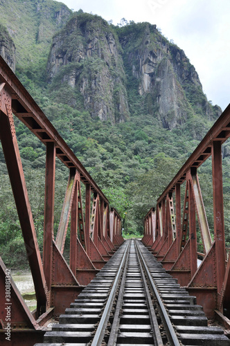 © Jen, Obraz premium Railroad tracks crossing a bridge near Aguas Calientes in Peru, the gateway to Machu Picchu